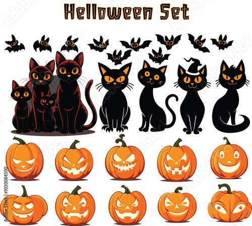 Halloween clipart with bats, pumpkin, black cat. Vector cartoon cute characters with scary smile. Fall party cosplay costume sticker set.