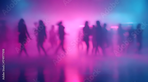 Halloween dance hall blurred moving silhouettes of costumed dancers in foggy neon glow,