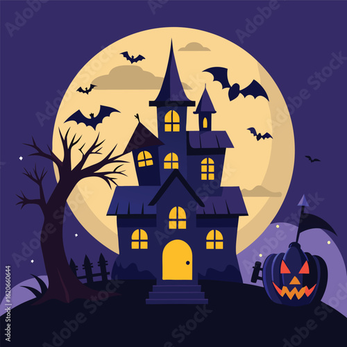 halloween, moon, night, house, castle, bat, bat, pumpkin, haunted, holiday, illustration, vector, silhouette, scarey, autumn, skittish, horror, tree, dark, cartoon, october, black, cat, celebration, hill, creepy, fear, monster, sorcerer, grave, skull, ghost, lantern, spider's web, eerie, costume, full moon, mystery, shadow, magic, trick or treat
