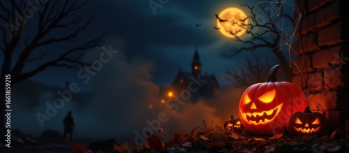 halloween, october, autumn, night, dusk, lantern, carved, pumpkin, light, glow, orange, stone, wall, spider's web, skittish, eerie, haunted, house, moon, full, sky, star, dark, gloomy, creepy, mystery, fright, terror, shadow, silhouette, atmosphere, decoration, scene, traditional, seasonal, holiday, celebration, night time, illumination, old, ancient, architecture, brick, rustic, ominous, menacing, ghostly