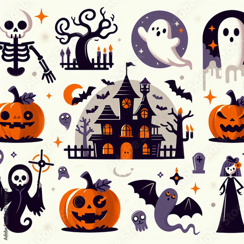 halloween, pumpkin, vector, night, moon, bat, holiday, autumn, cartoon, house, silhouette, illustration, tree, sorcerer, haunted, cat, horror, skittish, ghost, october, set, castle, scarey, design, celebration, eye, skeleton, boo, afraid, grave, skull, coffin, frightened, generative, ai