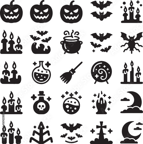 Halloween icons pumpkins bats cauldron broom potion skull moon graveyard jack o lantern flying bats