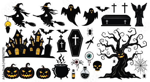 Halloween icons witches ghosts haunted house pumpkins bats coffin spooky tree spiders cauldron eyeballs potions skull angel crosses