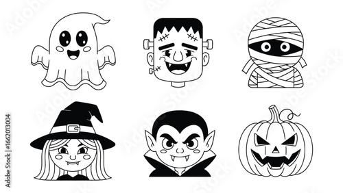 halloween, ghost, frankenstein, mother, sorcerer, vampire, festive, haunted, eerie, design element, trick or treat, scarey, cute, monster, costume, autumn, holiday, celebration, party, fun, black-and-white, outline, vector, graphic, symbol, drawing, artwork, image, design, element, decorative, cheerful, whimsical, seasonal, tradition, enjoyment, amusement