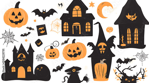 halloween, moon, house, night, bat, pumpkin, vector, silhouette, castle, holiday, cartoon, autumn, horror, scarey, set, skittish, illustration, tree, haunted, ghost, october, sorcerer, cat, dark, bat