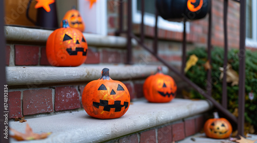 halloween jack o lantern pumpkin sitting on the front steps of a house