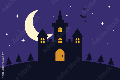 night, halloween, moon, house, illustration, castle, sky, tree, silhouette, vector, dark, holiday, skittish, bat, star, scarey, city, autumn, horror, hill, cartoon, cat, home, black, town