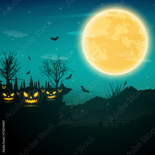 halloween, background, moon, skittish, illustration, night, pumpkin, vector, scarey, horror, holiday, poster, celebration, october, evil, dark, party, autumn, seasonal, full, design, invitation, card, silhouette, cemetery, treat, flier, house, landscape, bat, black