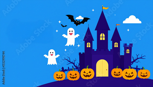 Halloween night, haunted castle, spooky pumpkins, cute ghosts, bats flying