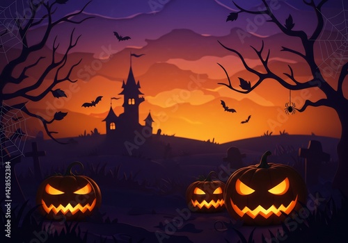 halloween, pumpkin, castle, sunset, night, bat, cemetery, skittish, scarey, autumn, orange, purple, dark, illustration, digital artwork, vector, holiday, october, celebration, gothic, fantasy, silhouette, tree, landscape