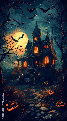Halloween night with a spooky house and bats, halloween background