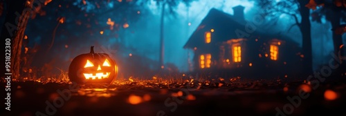 Halloween Night with Haunted House and Blue Moon - Background with Copyspace for Event Flyers