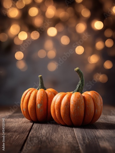 Halloween, orange pumpkins on a wooden table on a bokeh glowing background, copy space