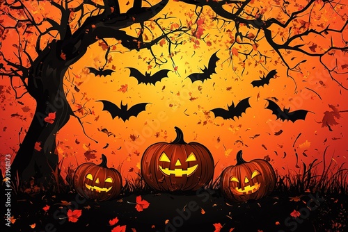 Halloween party background, full moon night illustration, Halloween pumpkin ghost, abandoned house, cemetery, bat, scary tree and Halloween elements Scary website Banner template Vector illustration