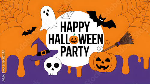 Halloween party graphic on a gradient orange to purple background with bats, spiderwebs, a ghost, skull, witch hat, jack-o-lantern and broom. Text reads "Happy Halloween Party".