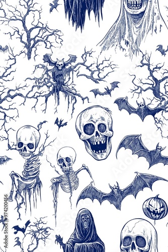 halloween, pattern, background, banner, poster, template, wallpaper, drawing, pen, crayons, art, bat, blue, design, detailed, ghost, ink, jack, jack-o-lantern, line, paper, pumpkin, scene, skeleton, symbol, texture, white, wrapping