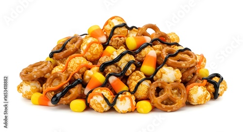 Halloween popcorn mix with candy corn, pretzels, and chocolate drizzle, white background, realistic professional snack photo.
