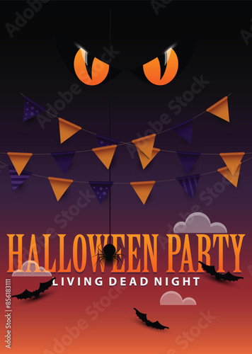 Halloween poster design for a party with mean eyes looking over yellow Halloween sign with flying bats and spier hanging from his net. Vector illustration.