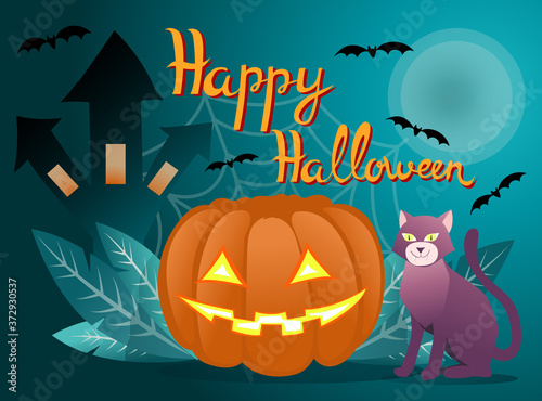 Halloween pumpkin and funny cat greeting card. Spider web background.Trendiy style poster. Trick or treat party. Autumn holidays. Vector.