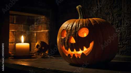 halloween pumpkin on a black background, jack o lantern, candle light, ai generated