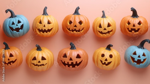 Halloween Pumpkin Patch: A vibrant assortment of carved pumpkins, each with a unique expression, displayed in a festive arrangement that captures the spirit of the holiday.