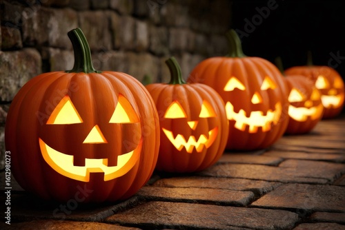 halloween, pumpkin, glowing, carved, skittish, night, cobbled, street, autumn, fall, october, holiday, celebration, decoration, orange, light, dark, scarey, eerie, festive, tradition, seasonal, humor, face, design, carving, illuminated, row, group, outdoors, background, copy space, illustration, digital artwork, wallpaper