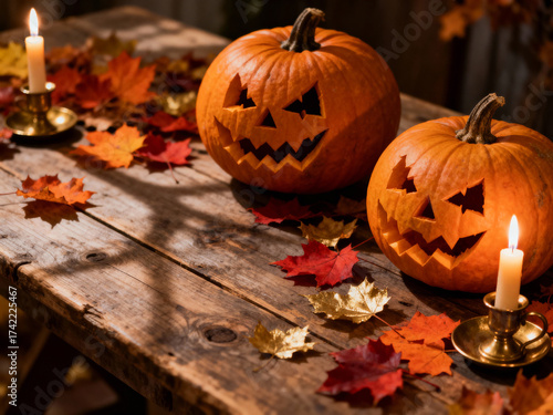 Halloween pumpkins with carved faces placed on a rustic wooden table, surrounded by autumn leaves. Ideal for seasonal marketing, cozy fall designs, and festive backgrounds.