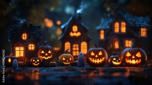 Halloween Scene with Glowing Jack-O-Lanterns, Spooky Houses, and Ghost Figures at Nightfall, Halloween decoration concept