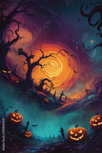 halloween, pumpkin, skittish, landscape, night, tree, cemetery, cemetery, bat, sky, orange, dark, creepy, autumn, fall, holiday, celebration, october, scarey, background, illustration, design, art, digital, painting