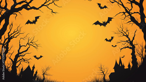 halloween, skittish, silhouette, bat, bare trees, orange background, creepy, festive, autumn, holiday, horror