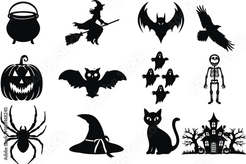 Halloween spooky silhouettes witch pumpkin ghost skeleton cat bat haunted house spider crow cauldron scary decoration icons
