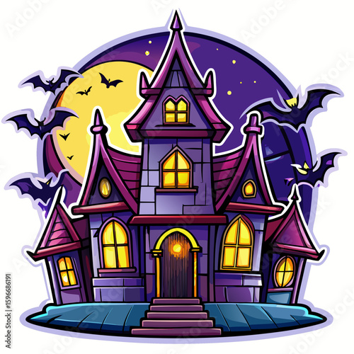 house, halloween, night, castle, vector, illustration, cartoon, moon, building, town, haunted, skittish, home, art, tree, bat, tower, sky, princess, scarey, architecture, holiday, silhouette, old, mediaeval