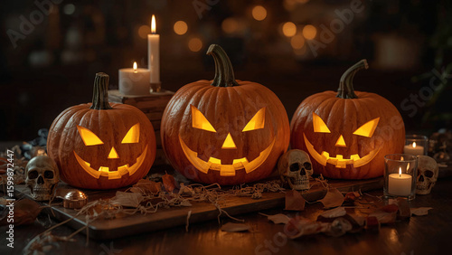 Halloween Still Life with Glowing Pumpkins – Cozy and Spooky Atmosphere