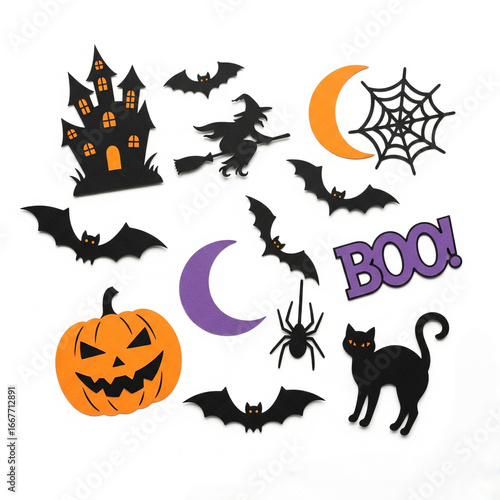 white background, sorcerer, broomstick, black cat, spider, spider's web, collection, clean, depth, flat, orange, black, white, composition, playful, graphic design, simple, festive, skittish, cute, art, illustration, design, holiday, seasonal, motif, cut-out, decor, background, graphic, ghost