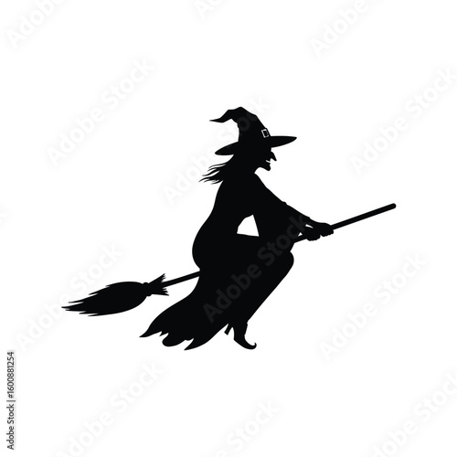 Halloween Witch Flying on Broomstick Silhouette Vector Icon, Spooky Sorceress