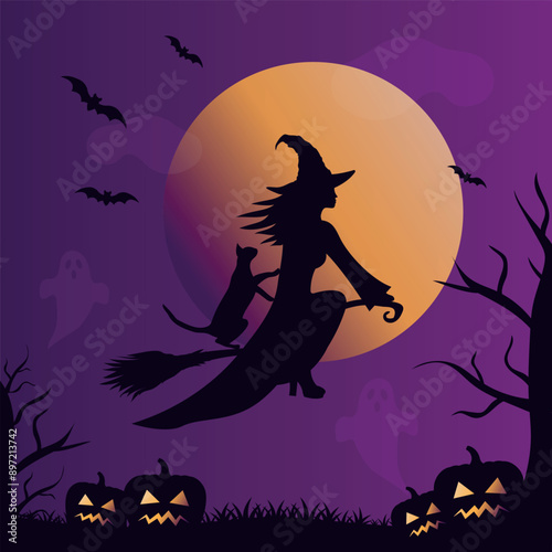 Halloween witch with a cat on a broom silhouette over a purple dark night sky, spooky vector illustration