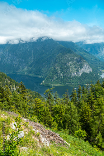 Hallstätter See, Bergpanorama und Obertraun in Hallstatt im Sommer Salzkammergut