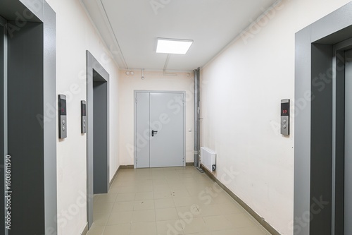 hallway, elevator, door, tiled floor, wall, light fixture, ceiling, grey, white, corridor, indoor, architecture, construction, apartment, floor, tile, emergency exit, pipe, radiator, industrial, modern, commercial, residential, clean, neutral, access, utility, maintenance, infrastructure, square, rectangular, symmetric, orderly, sterile, dull, functional, plain
