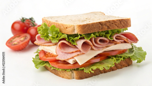 sandwich, bread, food, tomatoes, lettuce, ham, cheese, isolated, snack, lunch, white, meal, healthy, breakfast, salad, fresh, meat, vegetable, toast, green, diet, wheat, plate, closeup, bacon