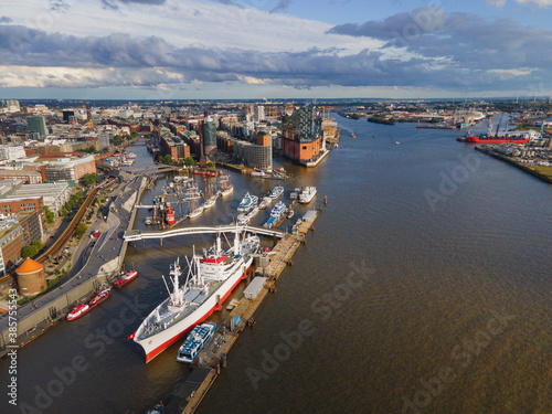 Hamburg, Germany - city center with all the sights on the shore with a view of ships