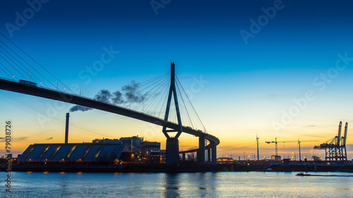 hamburg, port, evening, lighted, lighting, image, blue, bridge, container, german, elba, flux, freight, freighter, freeport, hamburger, background, illumination, light, van, metropolis, by night, ship, shipping, forwarding, street, symbol, transport, typical, connection, connection, landmark, mural, water, postcard