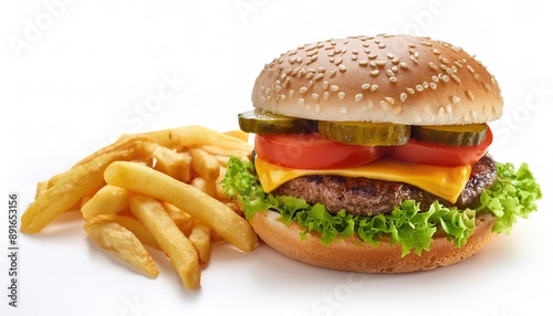 hamburger, cheeseburger or burger is a dish consisting of filling, usually a patty of ground flame broiled meat, typically beef placed inside a sliced bun or bread roll. served with french fries