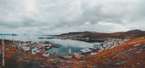 Hammerfest Norway, Panorama of the city and the bay with cloudy weather