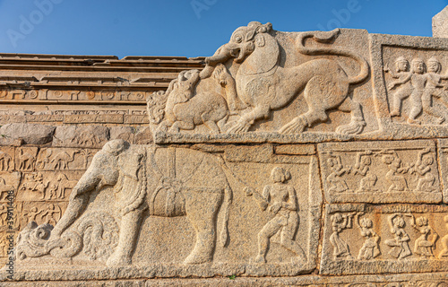 Hampi, Karnataka, India - November 4, 2013: Part of base of Mahanavami Dibba or the Dussehra Platform. Monumental sculptures as side of stairway show elephant, dancing women, and othr beasts.