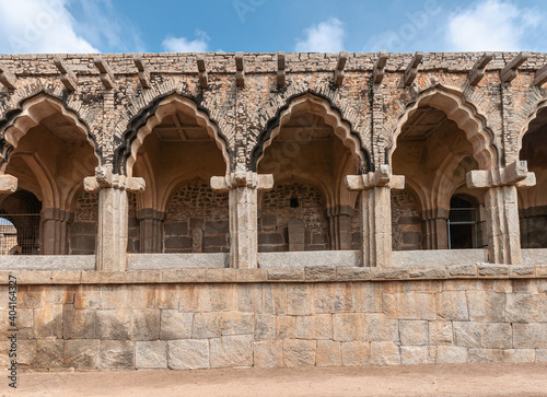 Hampi, Karnataka, India - November 5, 2013: Zanana Enclosure. Facade of arches at archeological items brown-stone exhibition hall under blue cloudscape