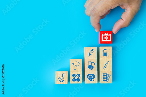 Hand choose medicine bag on cube wooden toy blocks stack with other health care and safety medical symbols concepts of healthy or sick prevent and illness treatment and insurance.