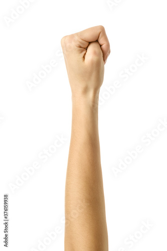 Hand clenched in a fist. Woman hand gesturing isolated on white