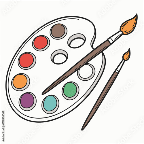 Hand drawn art supplies featuring an artist palette filled with colorful paints and two paintbrushes ready for creativity.