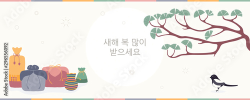 Hand drawn banner for Seollal with magpie, pine tree branch, traditional lucky bags and gifts, Korean text Happy New Year. Flat style design. Vector illustration. Concept for holiday card, poster.