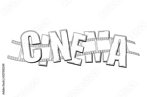 Hand drawn cinema film strip with text. Sketch frame film roll for festival, poster, flyer, banner. Cinematography arts hand drawn decorative film strip frame. Retro photo film. Vector doodle style.